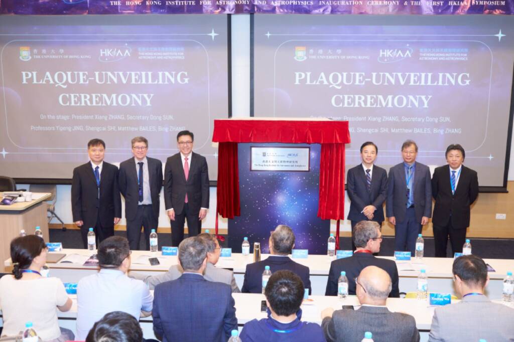 Plaque-unveiling ceremony of the Hong Kong Institute for Astronomy and Astrophysics. From left: Professor Bing Zhang, Founding Director of HKIAA; Professor Matthew Bailes, 2023 Shaw Prize Laureate in Astronomy; Professor Dong Sun, JP, Secretary for Innovation, Technology and Industry; Professor Xiang Zhang, President and Vice-Chancellor of the University of Hong Kong; Professor Yipeng Jing, Academician of the Chinese Academy of Sciences, Shanghai Jiao Tong University; Professor Shengcai Shi, Academician of the Chinese Academy of Sciences, Purple Mountain Observatory.